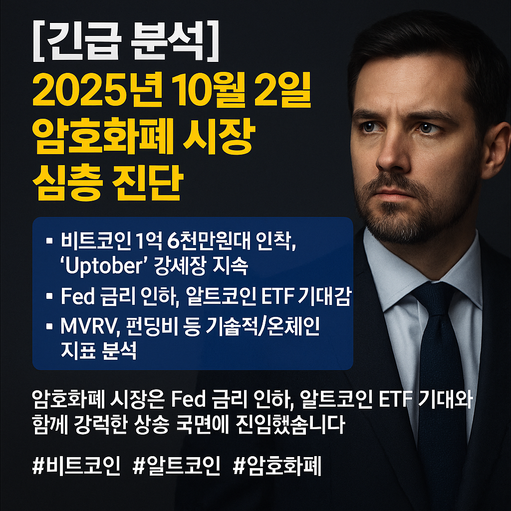 모든 지표를 종합 분석한 결과, 암호화폐 시장은 단기적인 변동성은 있겠지만, 구조적인 상승 채널을 확고히 할 것으로 예상됩니다. 10월의 역사적인 강세 경향('Uptober'), Fed의 금리 인하 사이클 시작, 그리고 알트코인 ETF라는 제도적 호재가 강력한 상승 시너지를 발휘하고 있습니다.