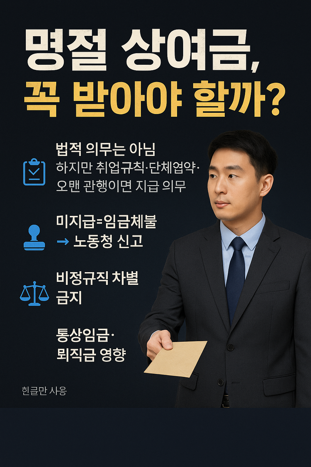 설날, 추석 명절 상여금은 법정 의무가 아닙니다. 하지만 회사 규정이나 관행이 있다면 반드시 받아야 합니다. 비정규직 차별 금지 원칙부터 상여금 미지급 시 노동청 신고 방법, 그리고 상여금이 당신의 퇴직금에 미치는 숨겨진 영향까지, 세계 최고 전략가가 핵심만 알려드립니다.