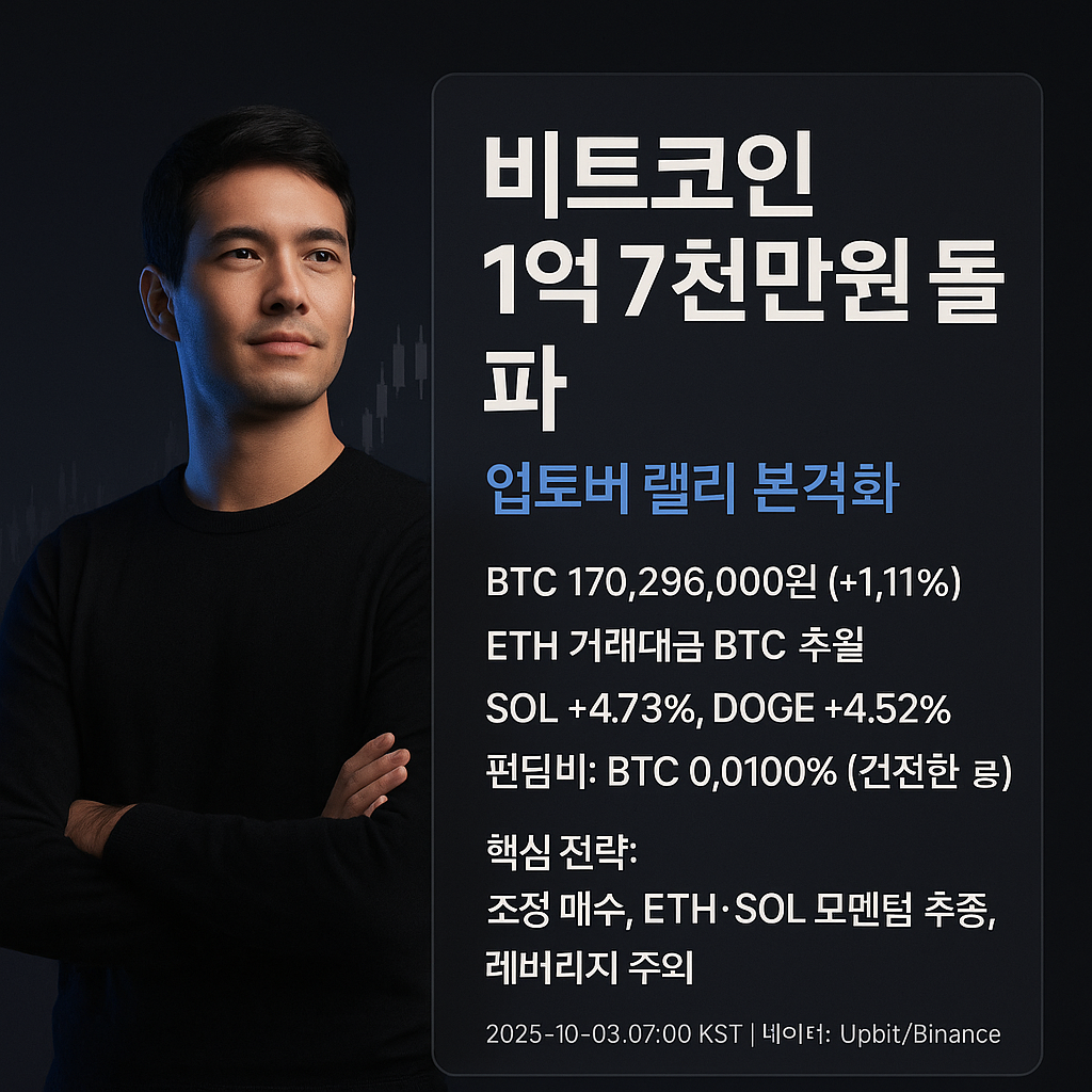 한국 시간 2025년 10월 3일 오전 7시를 기준으로, 암호화폐 시장은 역사적인 이정표를 세우며 강력한 강세장의 확산 국면에 진입했습니다. 비트코인(BTC)은 업비트 기준 170,296,000 KRW에 안정적으로 안착하며 1억 7천만 원 선을 돌파했습니다. 비트코인이 24시간 동안 +1.11% 상승하는 동안, 이더리움(ETH)은 6,337,000 KRW를 기록하며 +2.61%의 더 높은 상승률을 보였습니다. 특히 바이낸스 선물 시장에서 이더리움의 거래대금(196.7억 달러)이 비트코인(182.8억 달러)을 뛰어넘는 현상은, 시장의 단기적인 관심과 유동성이 알트코인 섹터로 전환되고 있음을 명확히 시사합니다.