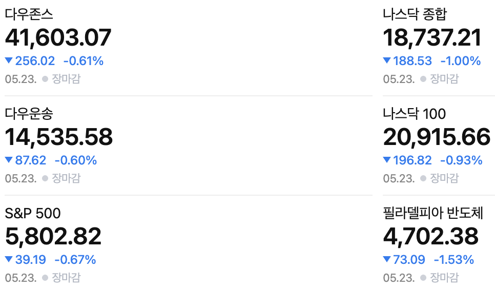 미국 증시는 트럼프 전 대통령의 50% 관세 부과 발언과 경기 둔화 우려로 일제히 하락 마감했습니다. 다우존스 산업지수는 41,603.07로 -0.61%, 나스닥 종합은 18,737.21로 -1.00%, S&P500은 5,802.82로 -0.67% 떨어졌습니다. 무역 긴장 이슈로 안전자산 선호 심리가 나타나며 기술주 중심의 나스닥이 조정을 받았고, 반도체 지수도 -1.53% 급락했습니다. 한편 안전자산인 금 가격이 급등하는 등 전반적으로 위험회피(리스크 오프) 심리가 두드러진 하루였습니다.