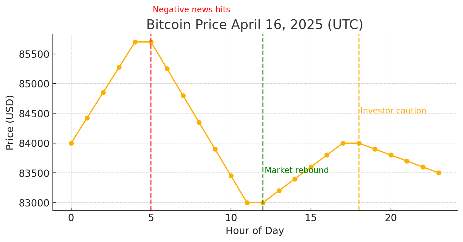 비트코인 4월 16일 가격 변동 추이 (UTC 시간 기준). 주요 뉴스 발생 시점마다 등락을 보이며 투자 심리가 요동쳤다.