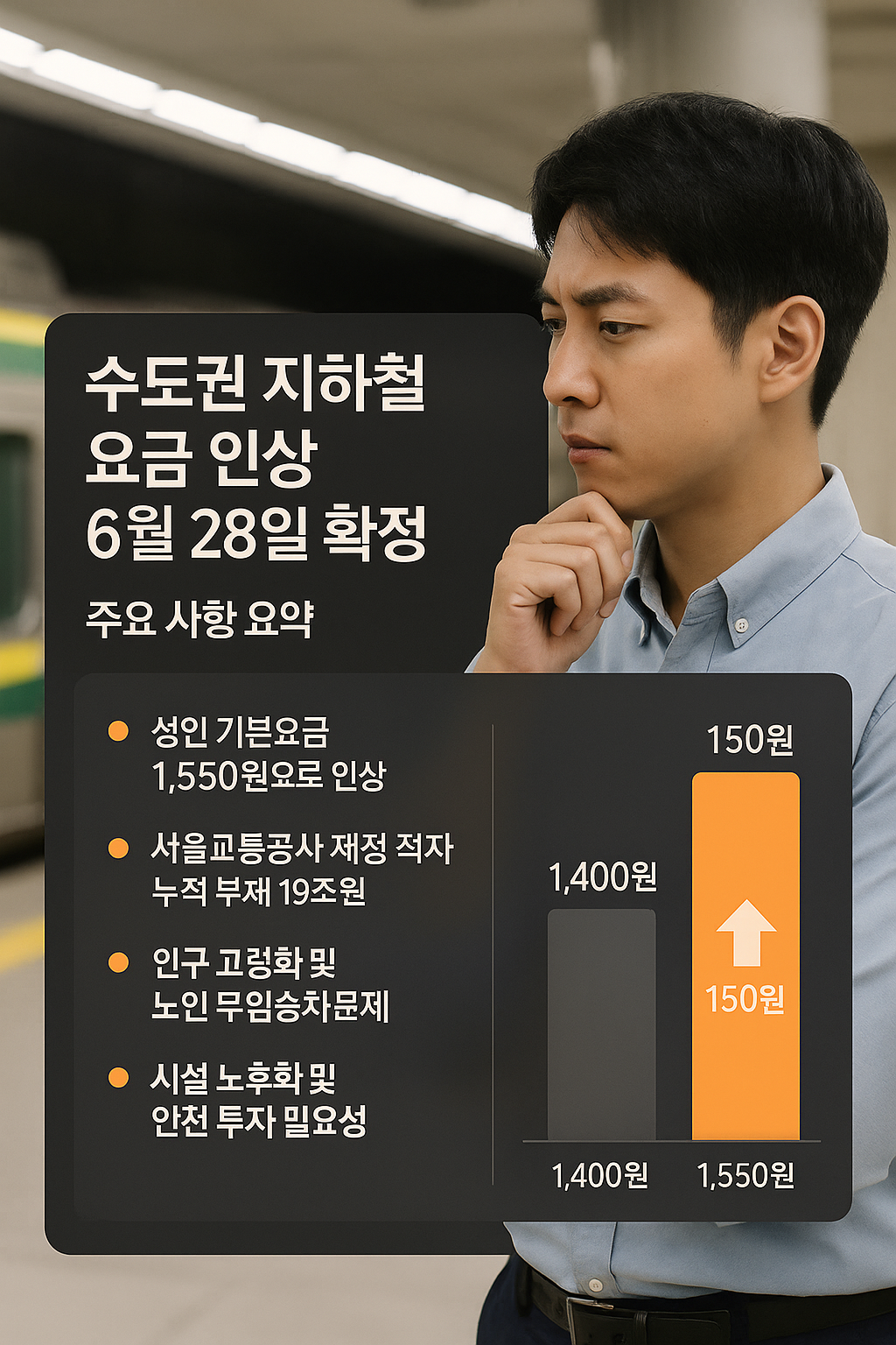 안녕하세요, 여러분! 오늘은 많은 분들의 일상에 직접적인 영향을 미칠 중요한 소식을 전해드립니다. 수도권 지하철 요금이 6월 28일부터 150원 인상된다는 소식, 들어보셨나요? 매일 출퇴근길에 지하철을 이용하는 직장인부터 학교를 오가는 학생들까지, 수도권에 사는 약 2,000만 명의 시민들에게 영향을 미칠 이번 요금 인상 소식은 많은 사람들의 지갑을 더 얇게 만들 예정입니다. 하루 1,400원이던 기본요금이 1,550원으로 오르면 한 달 출퇴근 기준으로 6,000원이 추가로 들어갑니다. 부담이 크죠?