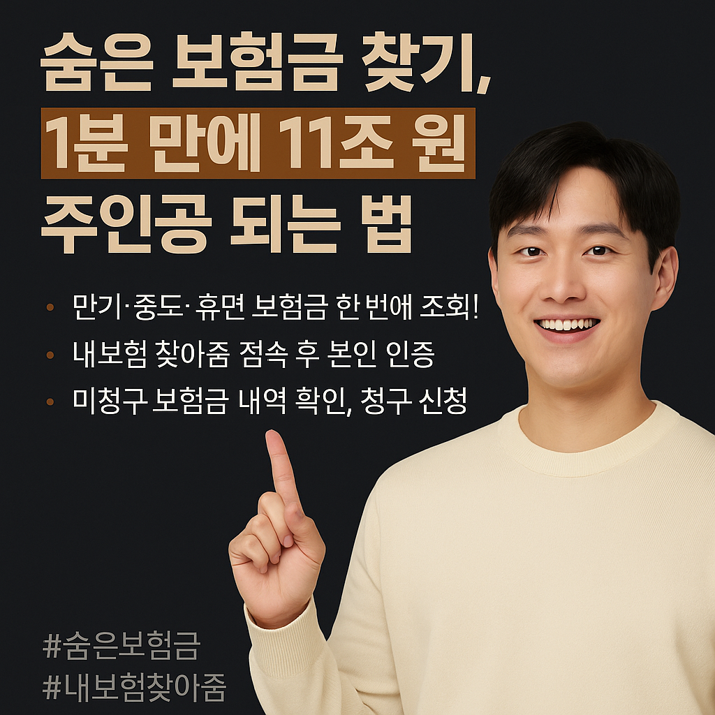 11조 원이 넘는 숨은 보험금을 아시나요? ‘내보험 찾아줌’ 서비스를 통해 잊고 있던 만기, 휴면, 중도 보험금을 1분 만에 조회하고 바로 청구하는 방법을 알려드립니다. 지금 바로 숨은 보험금 찾기에 동참하세요.