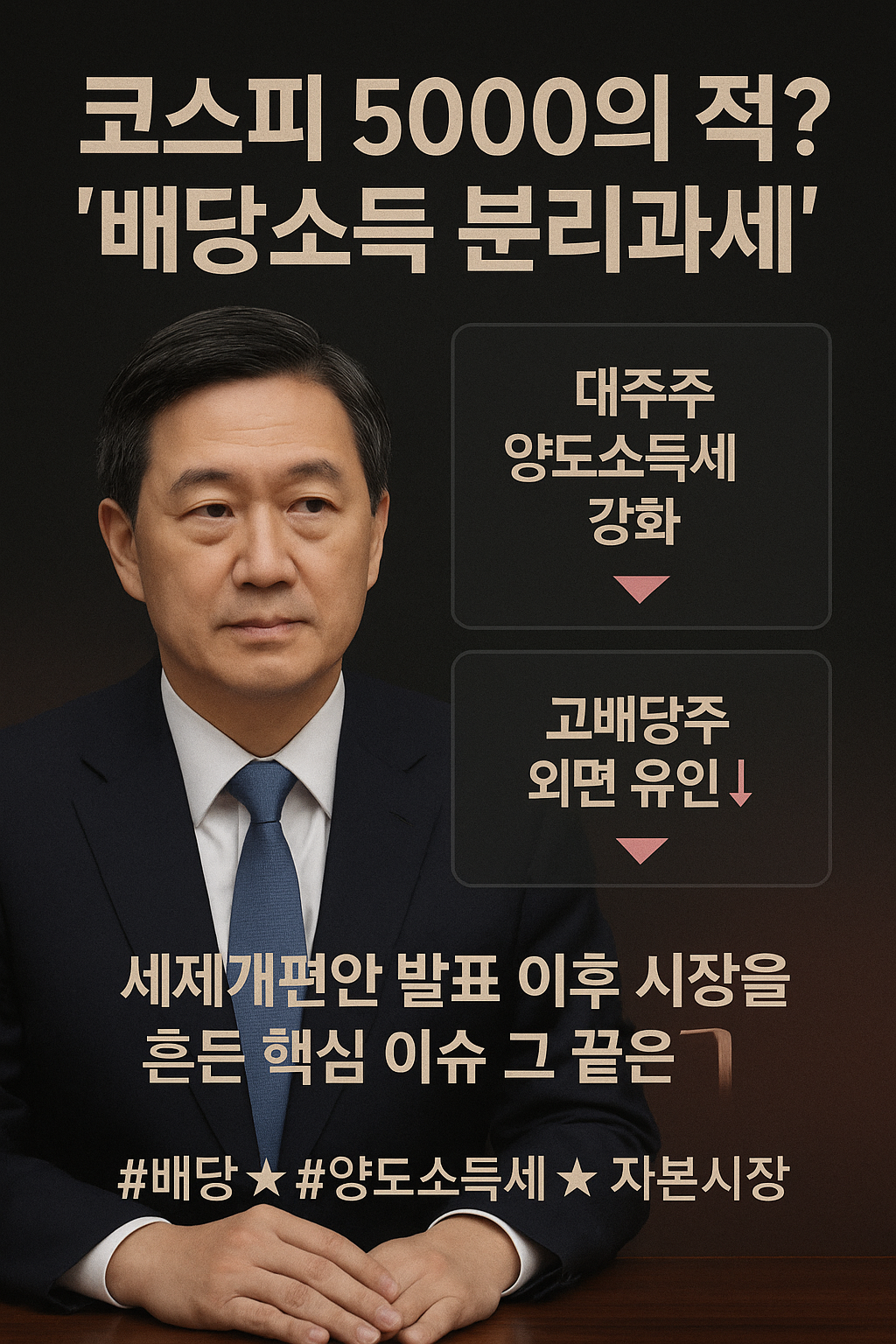 개편안의 핵심은 '배당소득 분리과세' 도입과 '대주주 양도소득세' 기준 강화입니다. 정부는 세제 형평성을 높이겠다는 입장이지만, 시장에서는 오히려 자본시장 활성화의 발목을 잡고 코스피 5000으로 가는 길에 장애물이 될 수 있다는 우려가 터져 나오고 있습니다. 과연 무엇이 문제일까요? 논란의 핵심 두 가지를 알기 쉽게 분석해 보겠습니다.