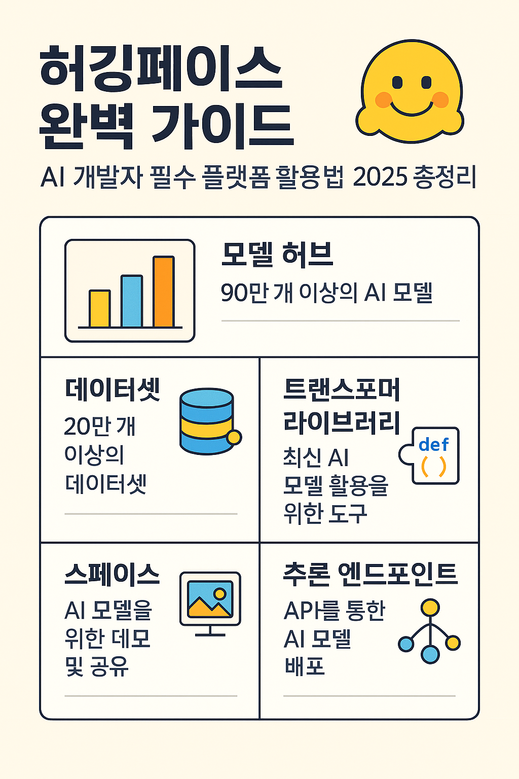 오픈소스의 힘을 최대한 활용하면서 AI 기술의 민주화를 선도하는 허깅페이스는 2025년 현재 AI 개발의 핵심 인프라로 자리매김했습니다.