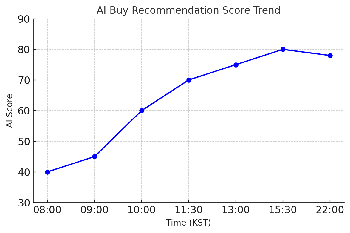 - 점수의 의미: 일반적으로 점수가 높을수록 매수 신호가 강하다는 것을 의미합니다. 예를 들어 70점 이상이면 “매수를 고려해볼 만한 긍정적 국면”으로, 50점 정도는 “중립(관망)”, 30점 이하는 “매수에 신중해야 할 단계”로 해석할 수 있습니다. 다만 점수는 절대적인 보장이 아니므로 참고 지표로 활용하는 것이 좋습니다.