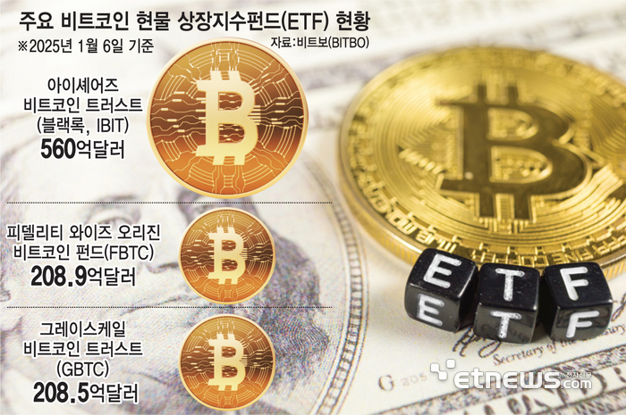 주요 비트코인 현물 상장지수펀드(ETF) 현황 (2025년 1월 6일 기준): 기관 자금 유입으로 비트코인 ETF 운용자산이 급성장하고 있다.