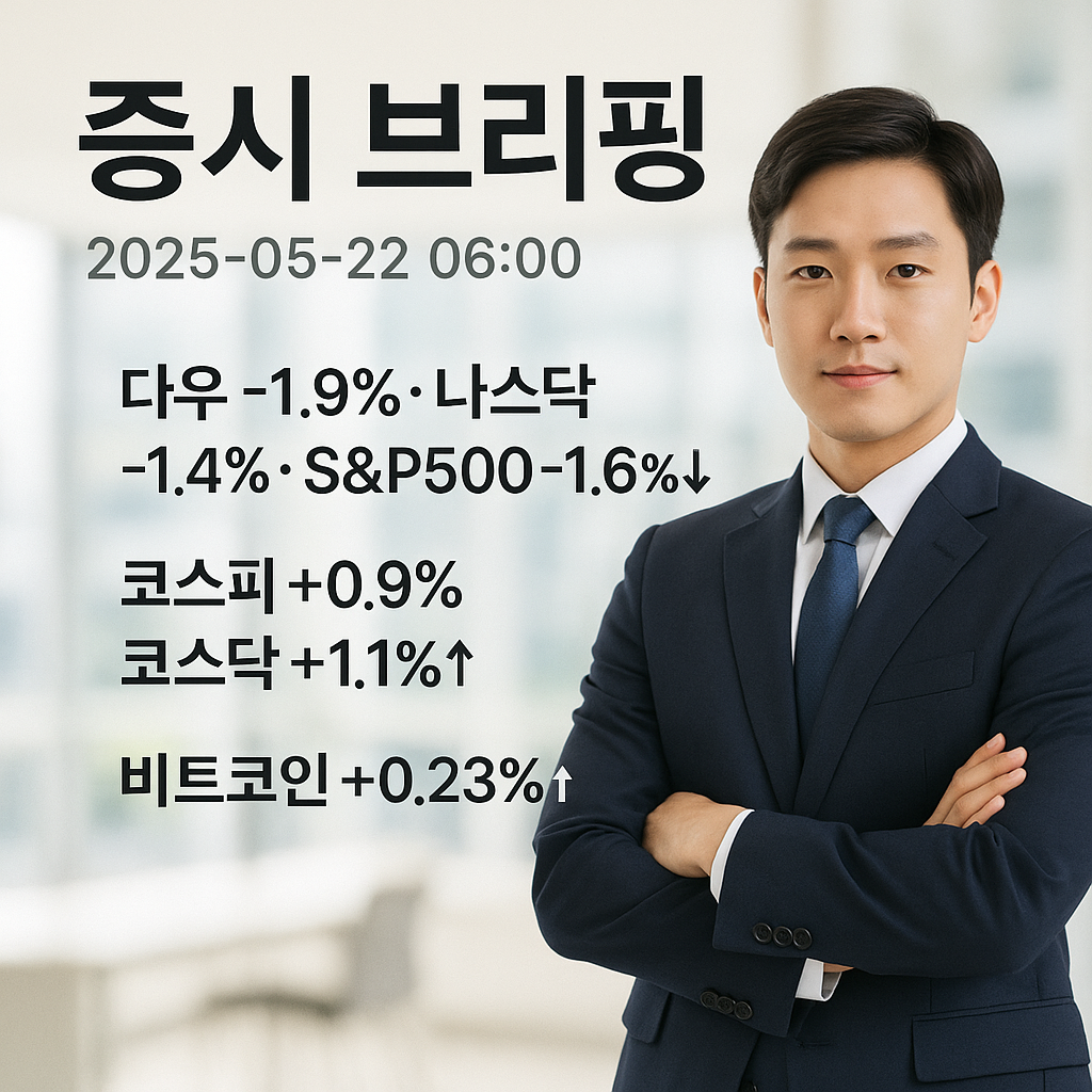 오늘(5월 22일) 증시는 미국발 악재 여파로 약세 출발이 예상됩니다. 간밤에 뉴욕 3대 지수가 큰 폭의 조정을 받은 만큼, 코스피와 코스닥도 투자 심리 위축으로 하락 압력을 받을 가능성이 높습니다. 특히 기술주 중심의 나스닥 급락 영향으로 국내 IT 대형주와 2차전지 등의 변동성이 커질 수 있으니 주의해야겠습니다. 다만 전일 하락으로 이미 일부 악재를 선반영했을 수 있고, 오전 중 기관의 저가 매수세 유입 여부에 따라 낙폭 과대 주들은 반등을 시도할 수도 있습니다.