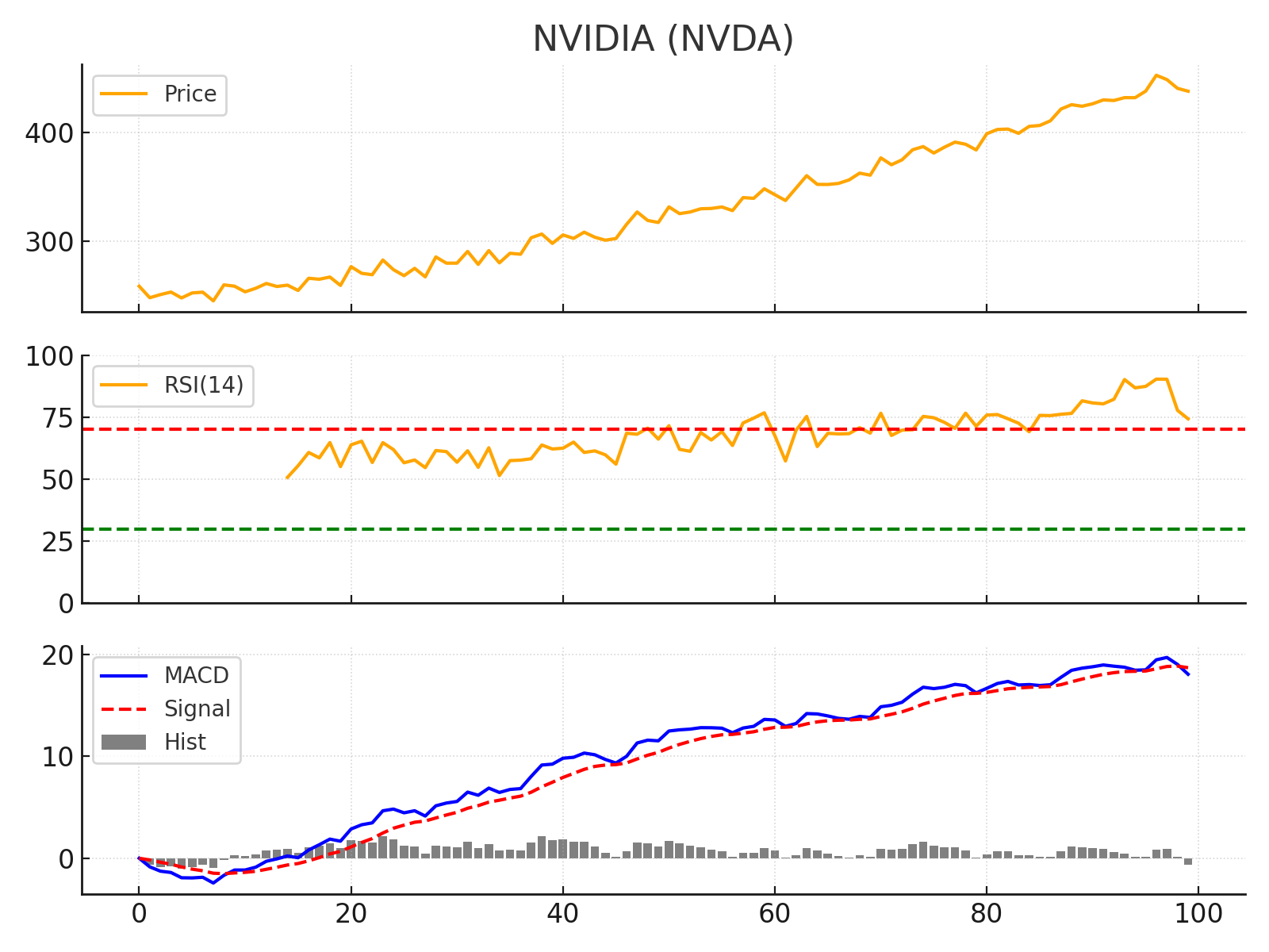 기술적 분석: 차트를 보면 엔비디아 주가는 저점 대비 두 배 이상 급등한 모습으로, 강한 상승 추세를 타고 있습니다. RSI 지표는 최근 80 부근의 과매수 영역까지 진입했다가 현재는 약 70 수준으로 내려왔는데, 여전히 매우 강한 모멘텀을 유지하고 있음을 알 수 있습니다. 이러한 높은 RSI는 주가 상승세가 강력했음을 보여주지만, 한편으로는 단기 과열 신호일 수도 있으므로 주의가 필요합니다. MACD 지표는 올 들어 지속적으로 양(+)의 값을 유지하며 MACD선이 신호선 위에서 벌어진 상태를 이어왔습니다. 히스토그램도 꾸준히 두터운 양수 영역에 있으며, 최근에도 약간 줄긴 했지만 여전히 상승 추세 유효를 가리킵니다. 기술적으로는 현재 주가가 단기 조정받더라도 $400 수준이 새로운 지지선으로 작용할 가능성이 있고, 상방으로는 시장 기대치에 따라 $500 돌파 여부도 중장기적으로 거론되고 있습니다. 물론 급등 뒤에는 흔히 소문에 사고 뉴스에 파는 흐름이 나올 수 있으므로, 실적 발표 전후로 변동성이 커질 수 있음을 유념해야 합니다. 엔비디아처럼 강세장인 종목은 추세 추종매매와 타이트한 손절라인 설정이 중요하며, 조정 시 분할 매수로 접근하는 전략이 유효해 보입니다.