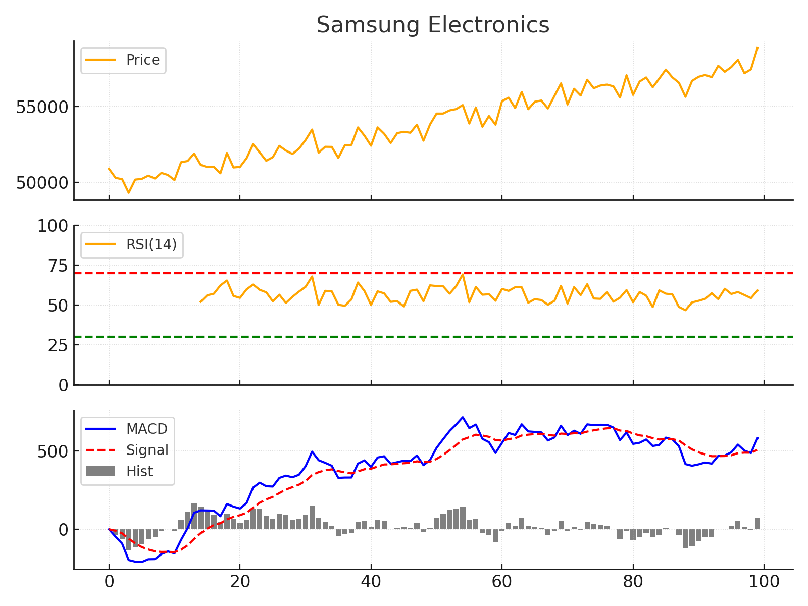 기술적 분석: 차트상 주가는 주요 이동평균선 위에서 상승 추세를 유지 중이며, 5일선과 20일선 모두 우상향하고 있어 중기 추세는 양호합니다. RSI 지표는 현재 60 안팎으로 비교적 양호한 편인데, 한때 70에 근접하며 약간의 과열 신호를 보이기도 했으나 조정으로 다시 안정권에 들어왔습니다. MACD 지표를 보면 MACD 선이 신호선 위에 있어 상승 모멘텀이 살아 있으나, 최근 히스토그램이 다소 줄어들어 상승 탄력은 예전보다 완만해진 상태입니다. 이는 삼성전자 주가가 단기 급등 후 숨 고르기에 들어갔음을 뜻합니다. 투자자는 5만5천원대 전후의 단기 지지선을 눈여겨볼 필요가 있고, 이 수준이 유지된다면 추가 상승을 기대해볼 수 있겠습니다. 반대로 조정 시 5만4천원대가 이탈되면 단기적으로 횡보 국면 진입을 염두에 두고 대응하는 것이 좋겠습니다.