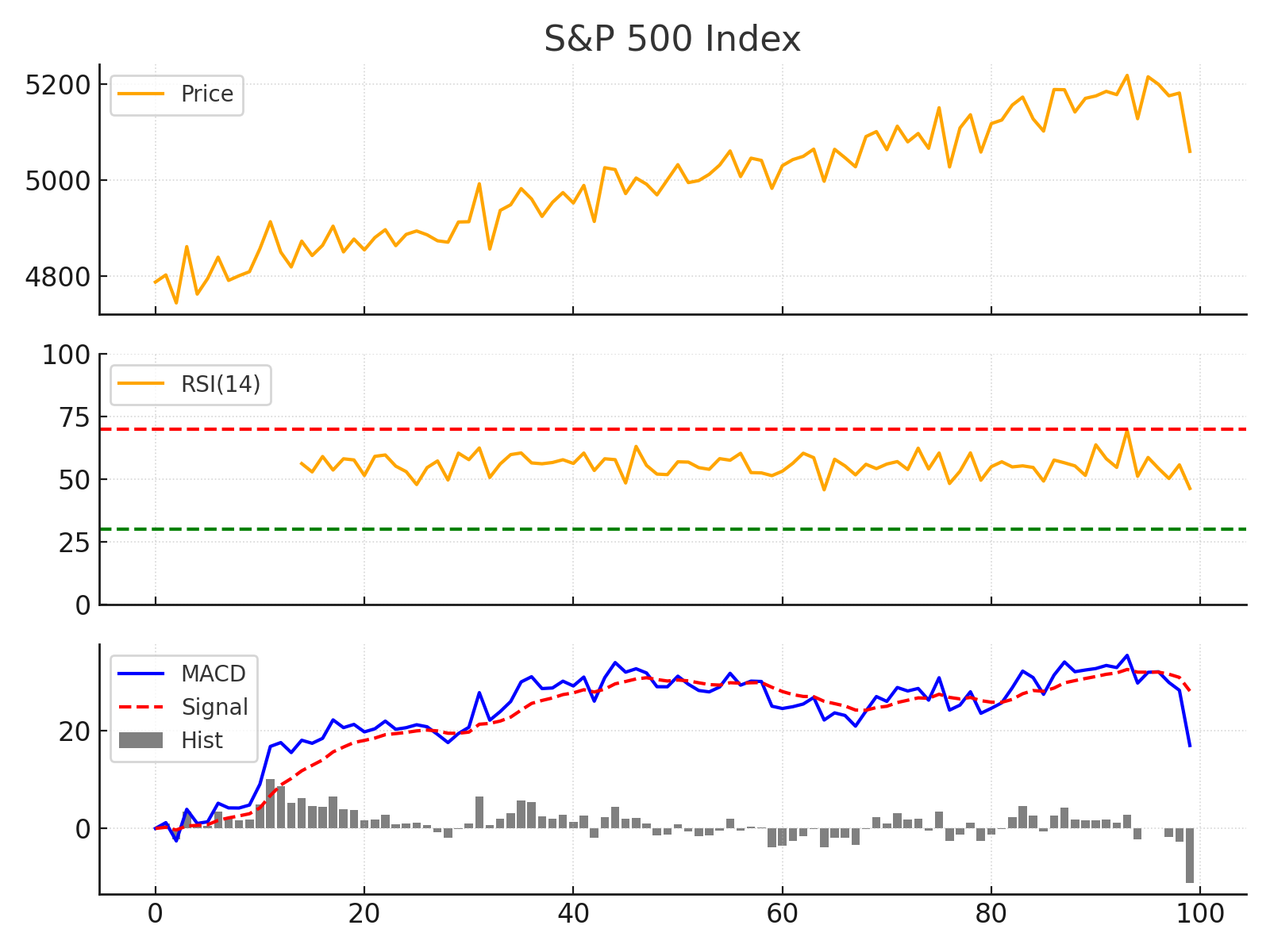 S&P 500 지수 일간 차트 – S&P500 지수는 5월 들어 견조한 상승 추세를 이어왔으나, 최근 며칠 사이 위로 꼬리를 단 음봉이 나타나며 상승세가 주춤하는 모습입니다. RSI 지표는 한때 60대 중반까지 올라 과열에 가까워졌다가 현재 50대 초반으로 내려와 중립 수준을 보입니다. 이는 단기 조정으로 과열이 해소되었음을 의미하는데요. MACD 지표는 여전히 0선 위에 있지만 푸른색 MACD선이 신호선에 점차 접근하며 상승 모멘텀이 약화되고 있음을 보여줍니다. 최근 며칠간의 급락으로 MACD 히스토그램도 줄어들고 있어, 단기적으로는 관망세 또는 추가 조정 가능성을 시사합니다. 투자자들은 이제 S&P500이 5,100포인트 전후 지지선을 유지하는지와, 향후 예정된 미 연준(Fed) 정책 발언이나 경제지표 발표에 주목할 것으로 보입니다.