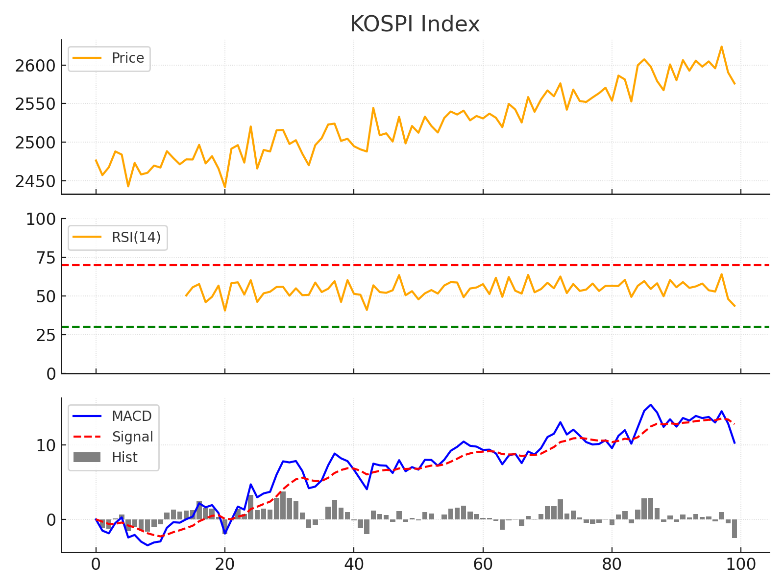 투자 전략으로는 당분간 보수적 접근과 분할 매수 원칙을 권장합니다. 글로벌 매크로 불확실성이 완전히 해소되지 않은 만큼 무리한 추격 매수는 지양하고, 주요 지수의 지지선 형성 여부를 확인하면서 단계적으로 접근하는 것이 좋겠습니다. 예를 들어 코스피 2,550p 부근이 기술적 지지선으로 여겨지는 바, 해당 수준 근처에서는 분할 매수로 위험을 분산할 수 있습니다. 기술적 분석 측면에서 RSI 등 모멘텀 지표가 과매도권에 진입하면 단기 반등을 노리는 전략도 가능하지만, 이때에도 거래량 확인과 철저한 손절선 설정이 필요합니다.