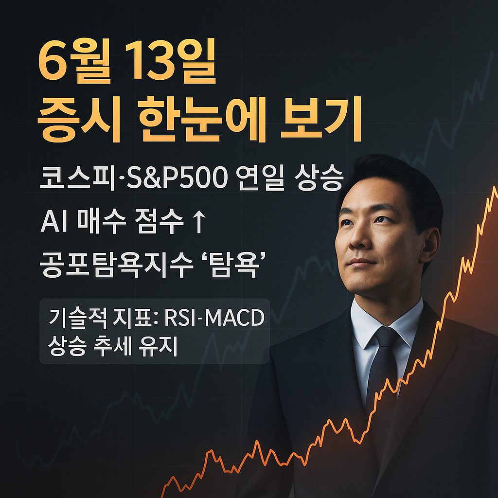결론적으로, 6월 13일 장 개시는 코스피·미국지수 모두 탄탄한 추세가 유지된 가운데 기술적 지표가 긍정적으로 나타나고 있습니다. AI 추천 점수도 ‘매수’ 신호로 전환됐으며, 공포탐욕지수 및 변동성 지표는 시장이 큰 불안 없이 견조함을 유지하고 있음을 보여줍니다. 다만 미·중 무역 불확실성, 정책 리스크 등 대외 변수는 여전히 존재하므로 중장기 투자시 신중한 모니터링이 필요합니다.