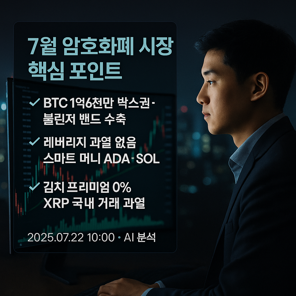 2025년 7월 22일 오전 10시, 암호화폐 시장은 표면적인 고요함 속에 거대한 에너지의 응축을 보여주고 있습니다. 비트코인이 1억 6천만 원 선을 두고 숨 막히는 힘겨루기를 벌이는 동안, 일부 알트코인들은 홀로 질주하며 시장의 다음 방향에 대한 복잡한 단서를 던지고 있습니다. 투자자들의 시선이 집중된 지금, 단순한 가격 등락률 너머에 숨겨진 시장의 진짜 속내를 파악하는 것이 그 어느 때보다 중요합니다.