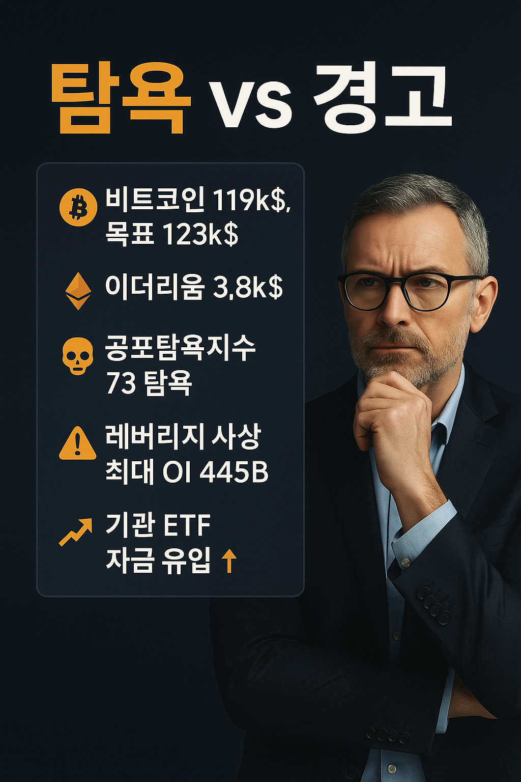 2025년 7월 28일 아침, 암호화폐 시장은 뜨거운 열기와 냉철한 경고가 교차하는 미묘한 지점에 서 있습니다. 비트코인은 역사적 고점을 경신한 후 숨을 고르고 있으며, 이더리움은 시장을 압도하는 퍼포먼스를 보여주고 있습니다. 투자자들의 심리는 '탐욕' 구간에 머물러 있지만, 그 이면에는 사상 최고 수준의 레버리지가 도사리고 있습니다. 지금 시장은 어디로 향하고 있는 것일까요? 기관 투자자라는 새로운 거인의 등장은 이 판을 어떻게 바꾸고 있을까요? 데이터에 기반한 깊이 있는 분석을 통해 2025년 여름, 암호화폐 시장의 현주소와 미래를 진단합니다.
