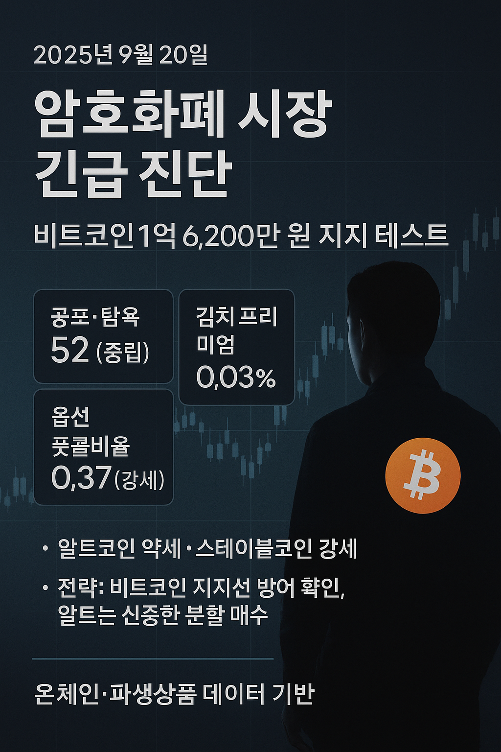 2025년 9월 20일 오전 8시, 암호화폐 시장은 전반적인 조정 국면에 접어들었습니다. 비트코인이 국내 거래소 기준 1억 6,200만원 선에서 비교적 견고한 지지력을 보이는 가운데, 이더리움을 비롯한 주요 알트코인들은 더 큰 폭의 하락을 겪으며 투자자들의 경계심을 자극하고 있습니다. 시장 전반에 걸쳐 하방 압력이 감지되지만, 그 깊이는 아직 제한적입니다.