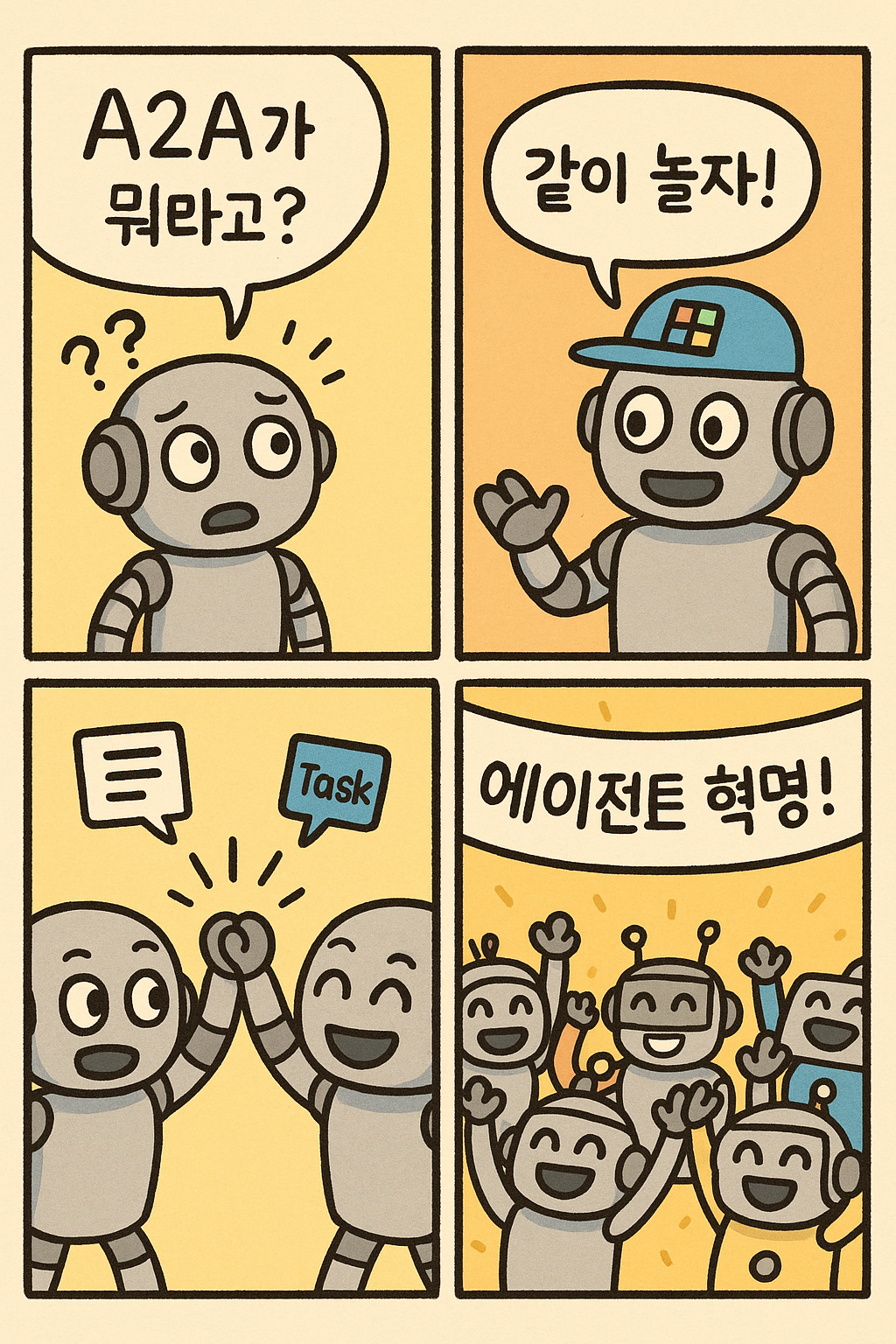 이번 4컷 만화는 구글이 주도하고 MS가 합류하며 “AI 에이전트의 공용어”로 자리 잡고 있는 A2A 프로토콜(Agent‑to‑Agent) 을 쉽고 유쾌하게 소개합니다.