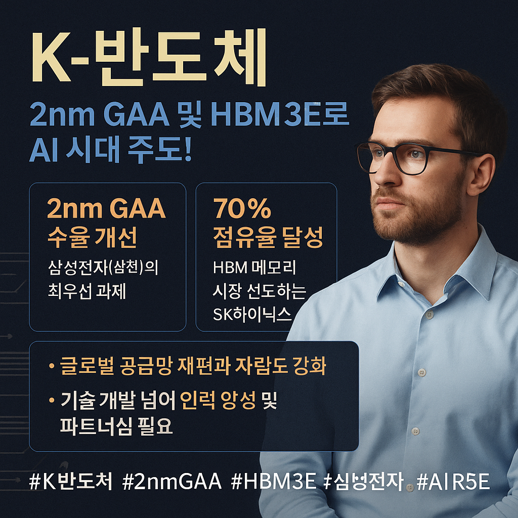 K-반도체는 초미세 공정 기술(2nm GAA)과 고성능 메모리(HBM3E)라는 두 축을 중심으로 글로벌 AI 시대의 핵심 동력으로 자리매김할 잠재력을 가지고 있습니다. 2nm GAA 파운드리 시장에서는 삼성전자의 수율 개선과 대형 고객사 확보가 최우선 과제이며, TSMC와의 격차를 좁히는 것이 중요합니다. HBM 시장에서는 SK하이닉스가 압도적인 리더십을 유지하는 가운데, 삼성전자는 HBM3E 인증 및 HBM4 개발을 통해 추격의 발판을 마련해야 합니다.